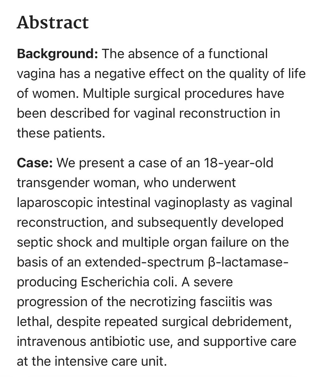 Doctors tried to make a vagina out of a colon. Sounds like a bad joke, except the patient died horribly. What has happened to medicine? Very soon we will look at these trans surgeries the way we now view lobotomies for depression, as a shocking violation of the Hippocratic Oath