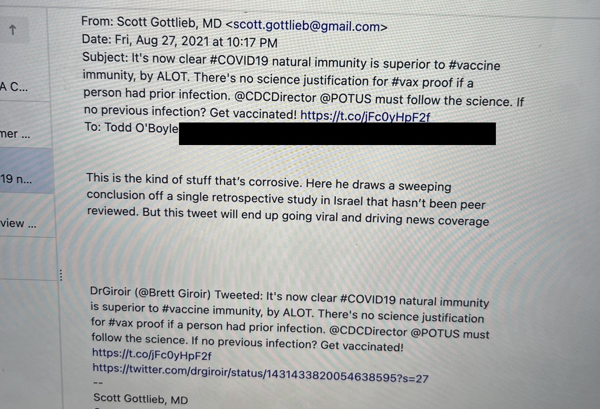 2/ In August 2021, Gottlieb told Todd O'Boyle - a senior manager in Twitter's public policy department - that a tweet from @drgiroir claiming CORRECTLY that natural immunity was superior to vaccine immunity was "corrosive" and might "go viral."