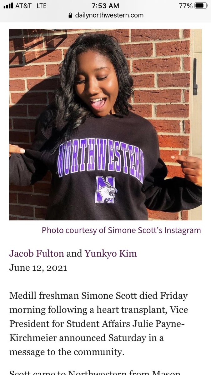 Simone, a first-year Northwestern University student, suffered a case of apparent myocarditis-induced heart failure on Sunday, May 16. Despite extraordinary measures to save her, including a heart transplant, she died Friday morning at Northwestern Memorial Hospital in Chicago.