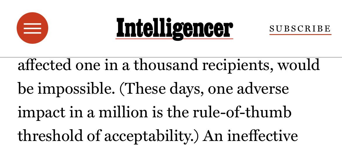 I’m old enough to remember when vaccinators and their media acolytes - hey, @dwallacewells! - said a jab that caused serious side effects more than once in 1 million people was unacceptable, and 1 in 1,000 would be disastrous. It was two years ago. My, the rules have changed…