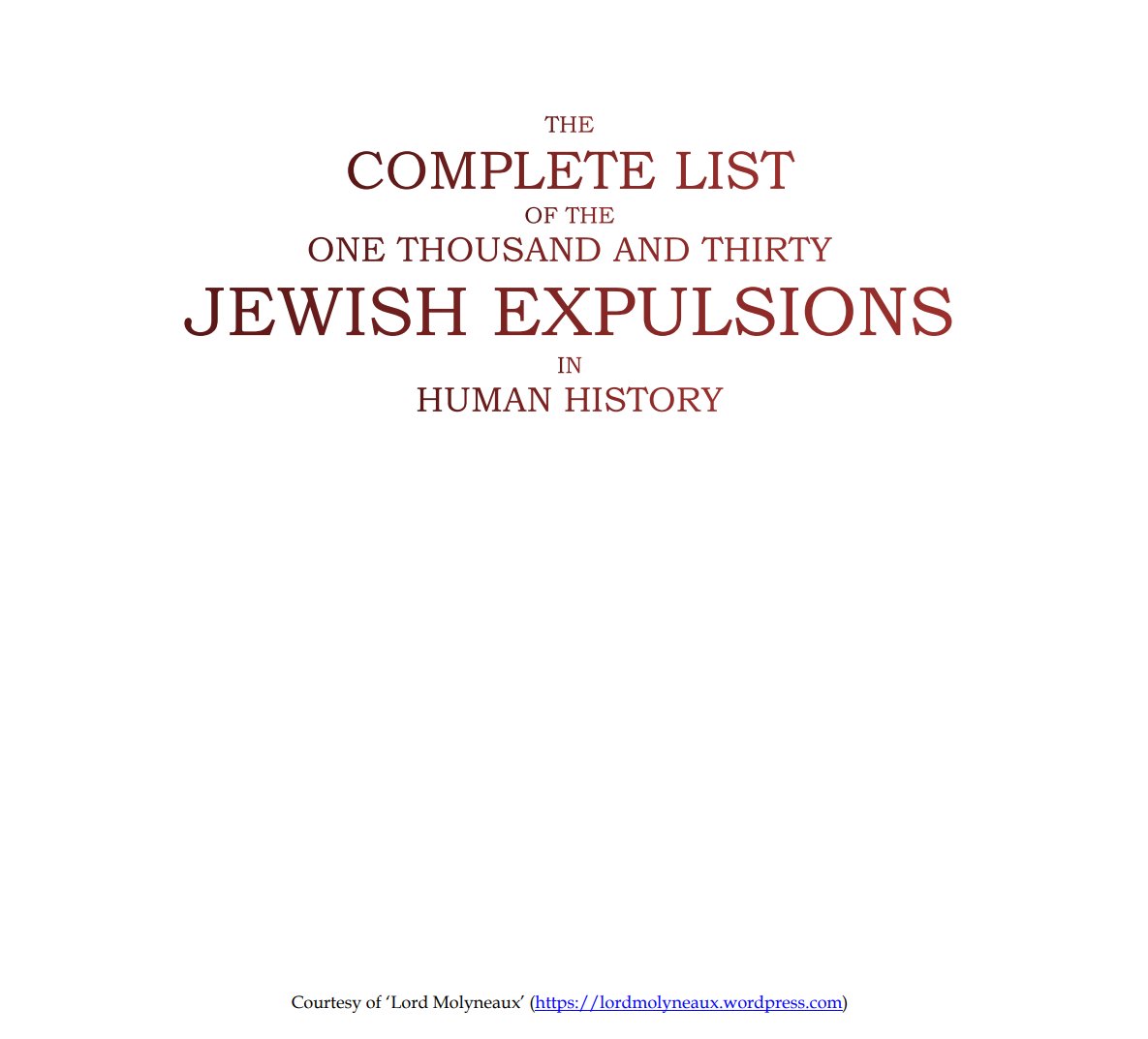 The Complete List Of The One Thousand And Thirty Jewish Expulsions In Human History : https://lordmolyneaux.wordpress.com : Free Download, Borrow, and Streaming : Internet Archive https://archive.org/details/the-complete-list-of-the-one-thousand-and-thirty-jewish-expulsions-in-human-history via @internetarchive