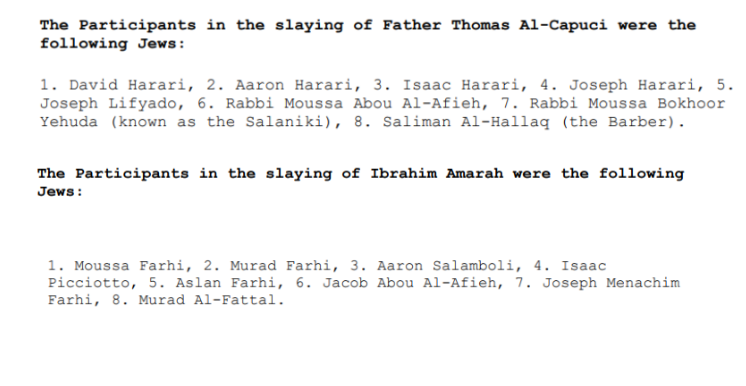 4/18 A j0oish barber, Soliman Saloom, confessed that rabbis Al-Afieh, Bokoor Yehuda, brothers David, Isaac, Joseph and Aaron Harari and Joseph Lifyado were seen with the priest. All denied knowledge and ultimately the authorities decided to book them for further investigation.