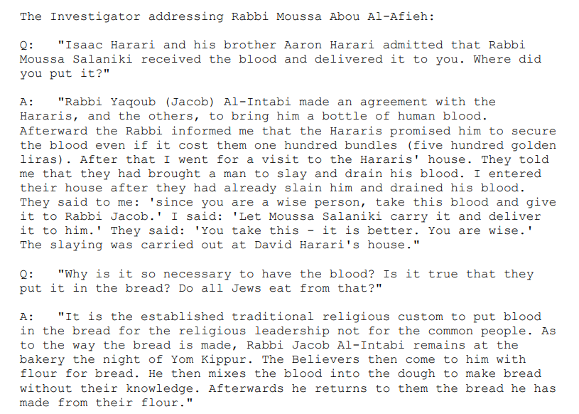 8/18 Testimony from rabbi Al-Afieh: 'It is the established traditional religious custom to put blood in the bread.' 'The believers come to him with flour he mixes the blood into the dough to make bread.' 'Afterwards he returns to them the bread he made from their flour.'