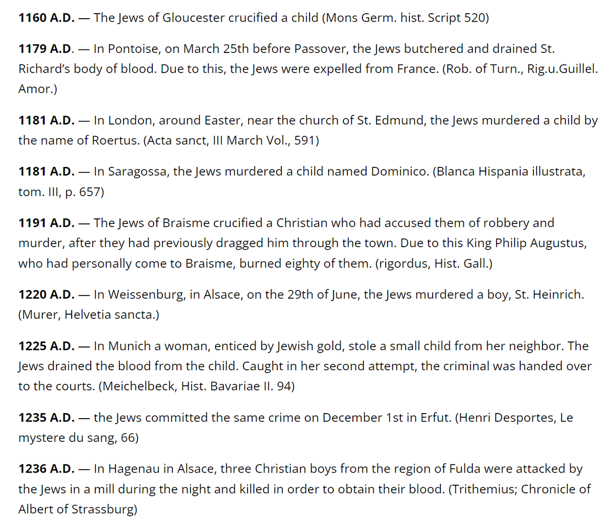 They claim its 'blood libel' but there are many, and some very well documented, cases of ritual murder throughout history against them. These cases were the cause of many of their expulsions over thousands of years. 18/ https://x.com/Amaleks_Rising/status/1750224883882074458?s=20