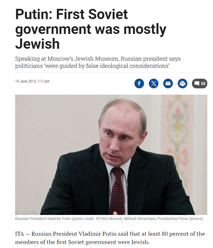Putin confirms that at least 80% of the members of the first Soviet government were ✡️ 26/ https://www.timesofisrael.com/putin-first-soviet-government-was-mostly-jewish/