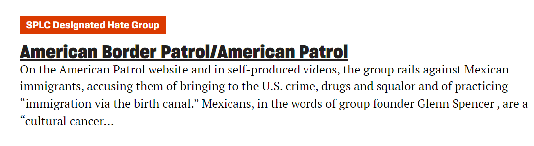 American Border Patrol is designated as a hate group by the SPLC because it opposes Mexican immigration. https://t.co/FSXRPQGVWk