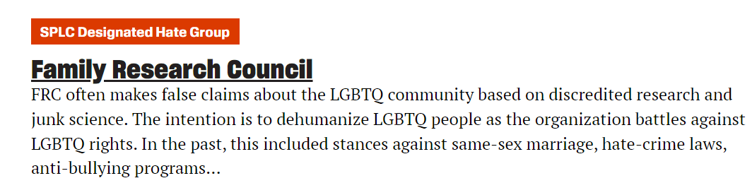 Family Research Council opposes the LGBTQ agenda; the SPLC deems this as hateful. https://t.co/w6Ouv4Oocg