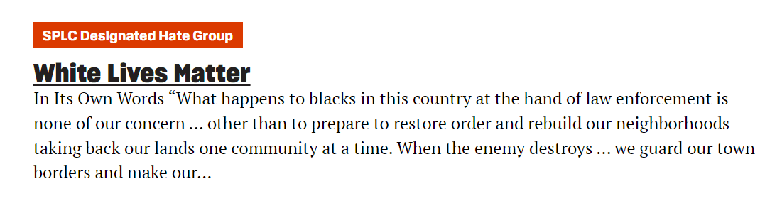 White Lives Matter is dedicated to promotion of the white race and taking positive action as a united voice against issues facing our race. So, of course the SPLC would designate WLM as a hate group. https://t.co/2tWBZKPHiR