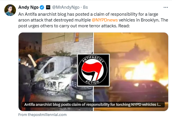 BREAKING NEWS: Antifa just claimed responsibility for firebombing multiple NYPD police vehicles last night. Time to officially label them as a terror organization!!! https://t.co/bgaVTTkHMD