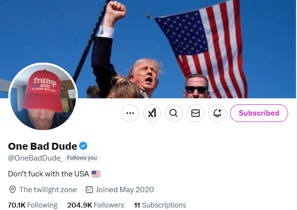 9. One Bad Dude (@OneBadDude_ ) OBD is another friend of mine. He always brings it with his political takes and is as MAGA as they come! https://t.co/fpeQxtAKxk