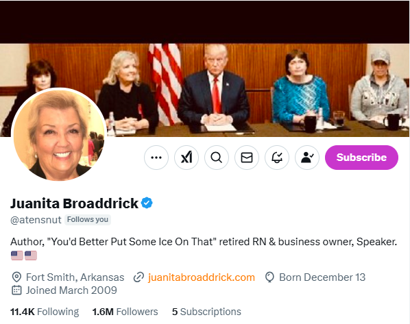 11. Juanita Broaddrick (@atensnut ) Juanita is a remarkable woman who has lived a remarkable life. If you haven't read her book "You'd better put some ice on that" I highly recommend it! https://t.co/XtEeuwRJab