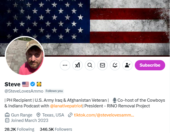 13. Steve (@SteveLovesAmmo ) Steve is a good friend! He is a purple heart Veteran and a great voice in our movement! Co-host of Cowboys and Indians podcast. https://t.co/bXn36p0cjy