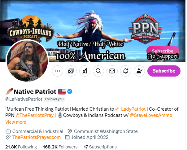 14. Native Patriot (@LaNativePatriot ) Native Patriot is the other co-host of the Cowboys and Indians podcast with Steve. He is a great patriot and I always look forward to his takes on current events! https://t.co/tfw7reV0Fx