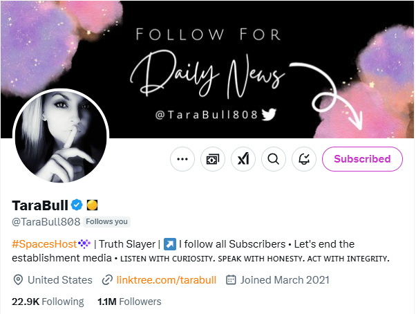 1. Tarabull (@TaraBull808 ) Tara is a great account that has takes from politics to American culture and everything in between. She always engages with her followers which isn't easy to come by these days! https://t.co/d8DU0Qfrh0