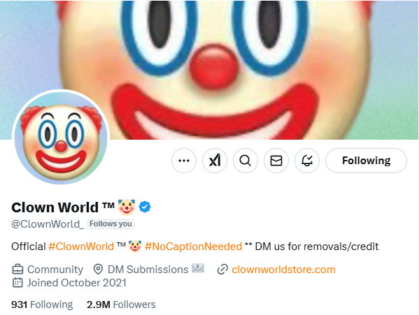2. Clown World (@ClownWorld_ ) Clown World is always bringing us breaking news takes as well as exposing the woke left for the clows they are. https://t.co/2vjvqAmMWo