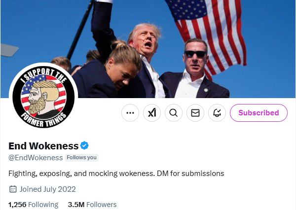 3. End Wokeness (@EndWokeness ) End Wokeness has quickly risen to be one of the best accounts on X. They are always exposing the radical left and bringing us great takes from politics. https://t.co/RxqZ82ifN7