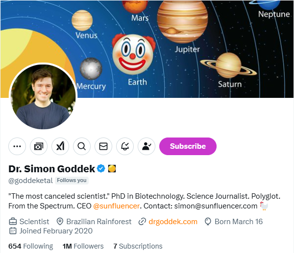 4. Dr. Simon Goddek (@goddeketal ) Dr. Simon has been fighting against the corrupt medical establishment for years and was even censored for his FACTUAL takes on the covid vaccines and testing. Show him some love! https://t.co/45tre03vUd
