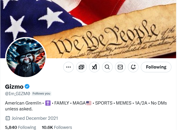 8. Gizmo (@Im_GIZM0 ) Gizmo is an up and coming account with MASSIVE potential! He is always cracking me up with his humor and has some great takes on politics and current affairs. I am honored to call him a friend. https://t.co/XL3Xtym8tp