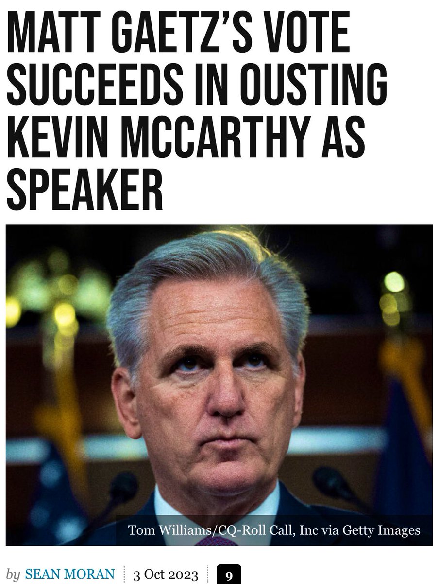BREAKING BYE-DONE: Motion to Vacate Speaker Kevin McCarthy passes 216 - 210. The first successful MTV in American history! All Kevin had to do is Release the J6 tapes. But instead he proved his loyalty to the FBI/CIA. 8 Republican Legends voted against McCarthy: Buck Biggs Crane Gaetz Good Mace Rosendale Burchett Kevin meant it literally: “Let’s go!” https://breitbart.com/politics/2023/10/03/matt-gaetz-vote-succeeds-in-ousting-kevin-mccarthy-as-speaker/