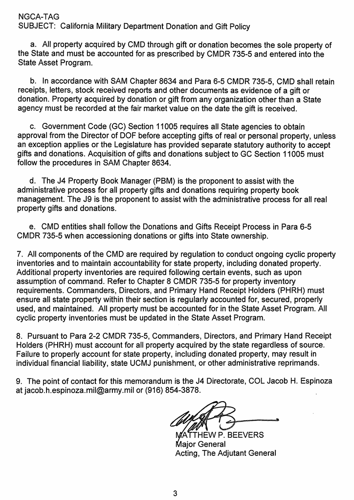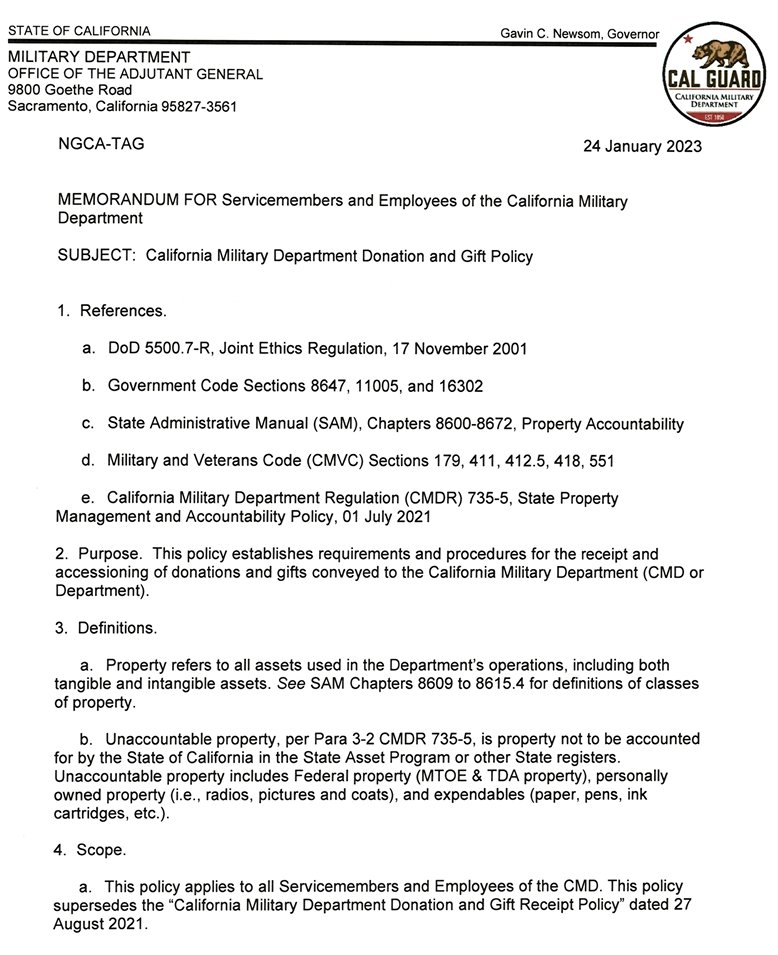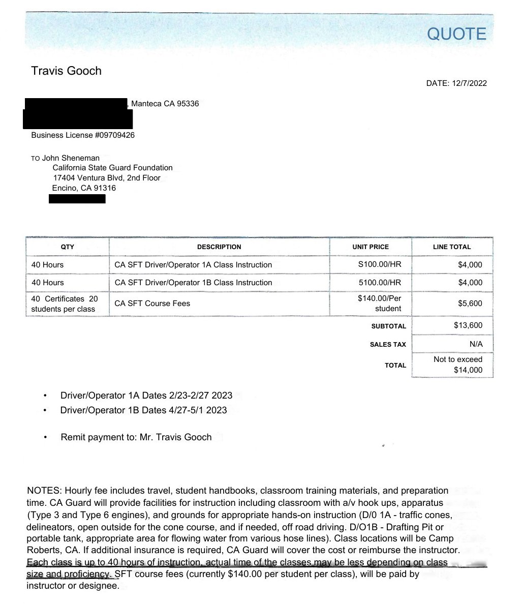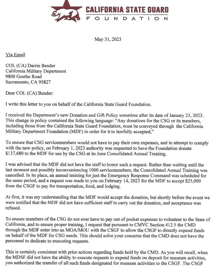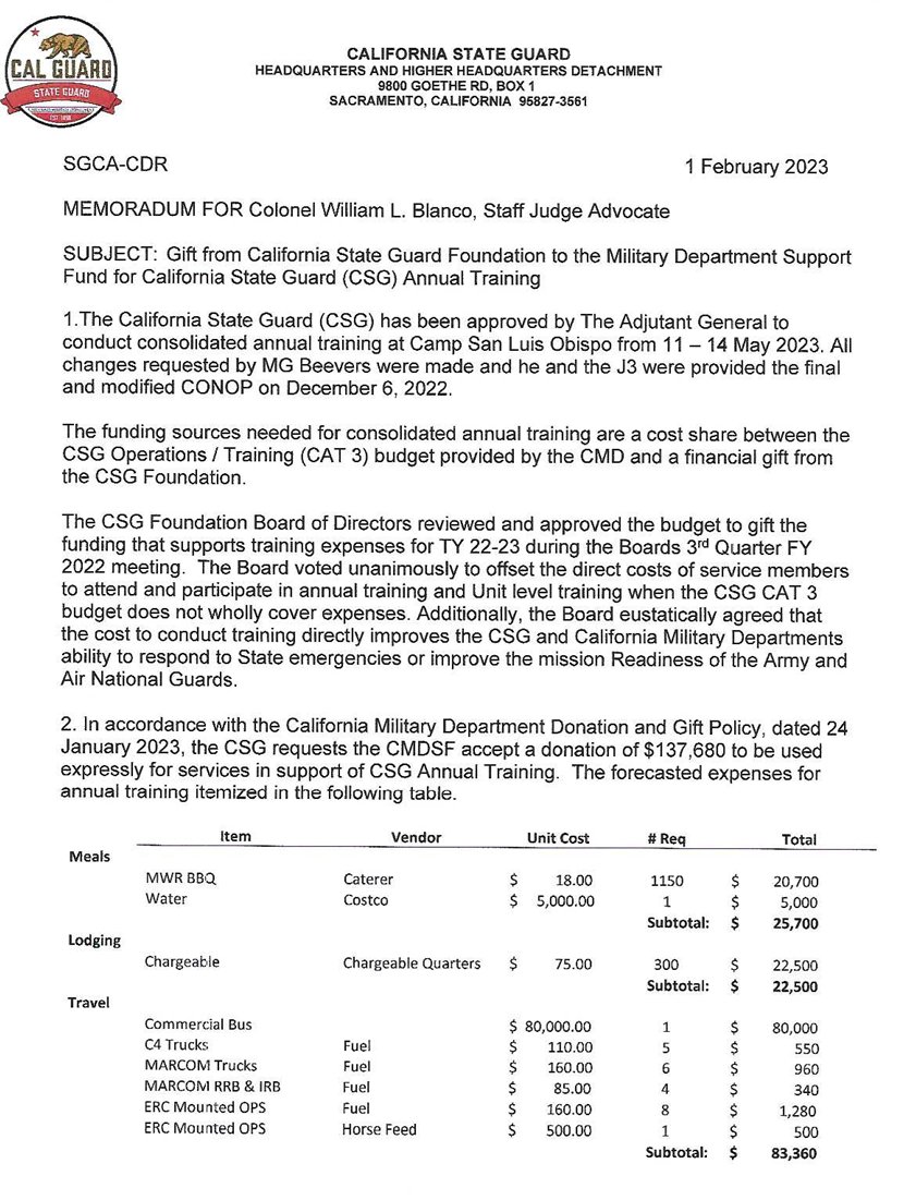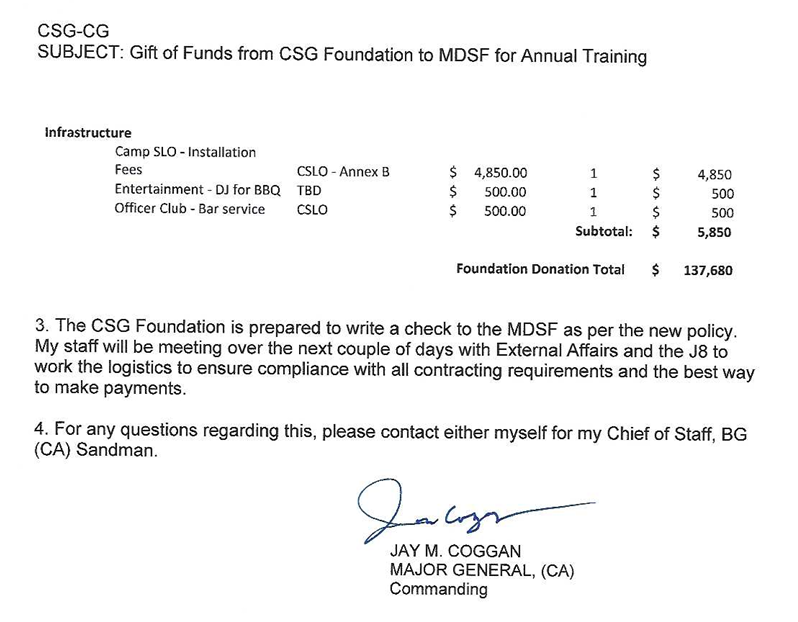 To Beevers, "gifts" such as these were illegal. The Cal. National Guard told me last year that the State Guard, and by extension Team Blaze, "had previously accepted funds illegally" from Coggan's charity. "This practice was stopped by Major General Beevers," they said.