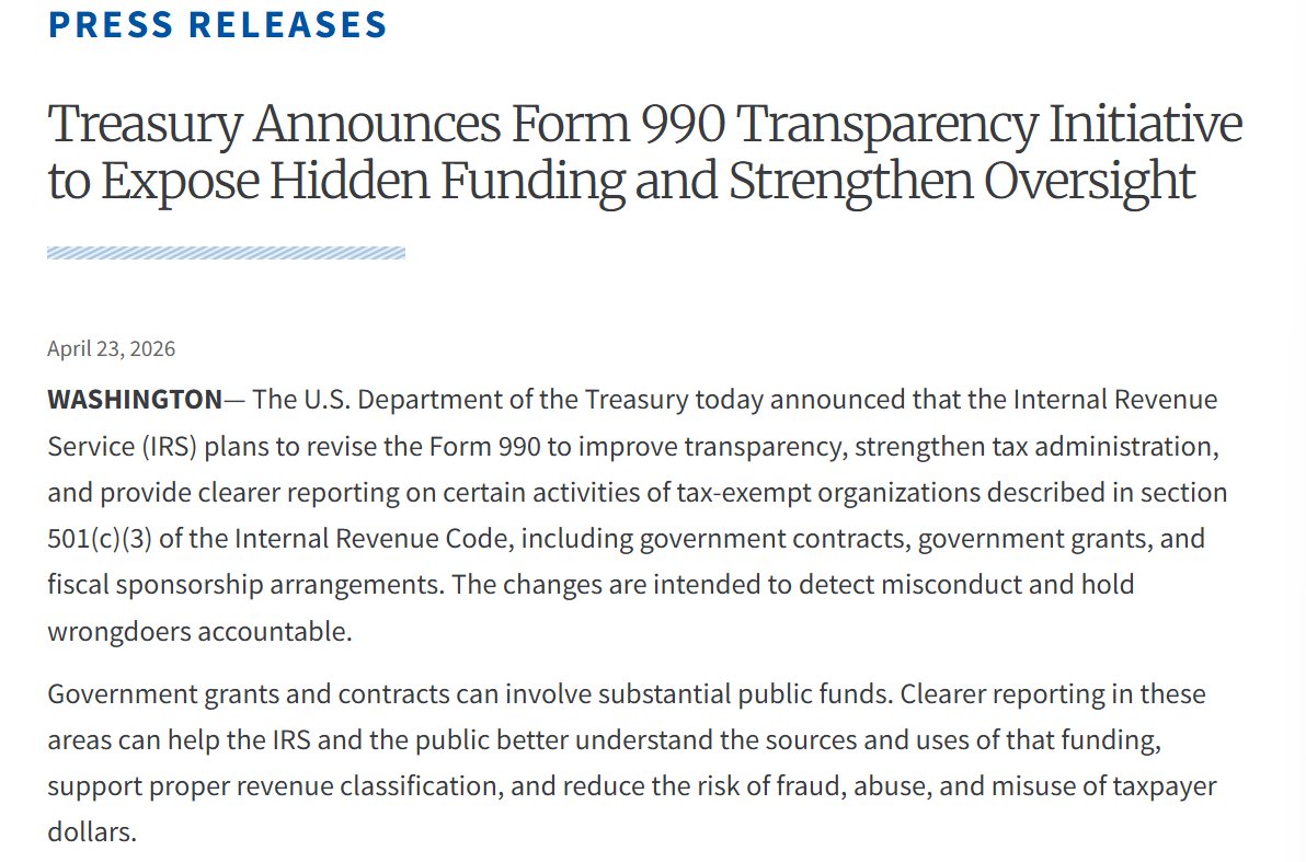 BREAKING: IRS announces plans to revise nonprofit Form 990 filings to require disclosure of fiscal sponsorships This is a big deal. Liberal dark money networks including Tides and Arabella have for decades exploited fiscal sponsorships to effectively operate in the shadows. https://t.co/3qjtUGVJk7