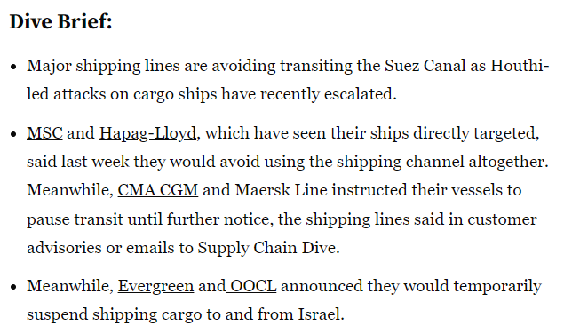 This Red Sea situation is very very bad. And while the best person to consult is a logistician, I want to take a laymans stab at it. Currently, container ships are being attacked regularly with anti ship missiles and drones via the Houthi's(Iranian Proxies in Yemen). The USS Carney, an American destroyer, has been in the region responding to attacks and shooting stuff out of the air. They've seen more action on the water in weeks than the entire USN saw on the water during GWOT in 20 years. This puts the US in a decision dilemma. Our mandate of heaven to justify the unipolar order is based upon the power of the USN to facilitate safe global trade. It's the beating heart of the international westphalian peace, the Pax Americana. The Biden Administration has had a lackluster response, probably due to its State Department being in a love affair with Iran.(In which an underreported Iranian spy ring was uncovered recently that the media is reticent to talk about) Maersk and other shipping giants were able to flex on the DoD to do something about it. Which is why more USN assets are being diverted to the Red Sea. But this doesn't resolve the strategic problem. What do we do about this? The US is in what's called a "decision dilemma", or a situation where there isn't a favorable outcome. As Lloyds moves to raise insurance rates on Suez transits (costs that will be passed downstream) or remove insuring these routes altogether (it's pretty expensive to have a cargo ship get hit by a missile) I feel Egypt is a major fulcrum of this problem. A massive share of Egypts income comes from the Suez Canal. This broke a record in 2022 at 9.4 billion USD, which is almost 30 percent of their annual revenue. If the Suez is closed, they aren't making money. The Egyptian Government is also stressed from multiple angles. They have a refugee crisis on their border with Sudan, but particularly topical right now is their land border with Gaza. The Rafah Crossing is the only link into Gaza that is not controlled by Israel. Iran having a quarter of the Egyptian economy by the balls unless the US intervenes, means Iran has leverage over what gets into Gaza. If you use your imagination, this could include anything from chemical weapons in Syria, to a dirty bomb or even a nuclear weapon from Iran being not beyond the realm of the possible. This is a nightmare scenario for the US because such an event might force a more tangible military commitment in the region than we already have. The other alternative is the US military escalating the middle eastern situation by striking Houthi capabilities in Yemen. This is well within the capabilities of the DoD to do fairly easily, and the State Department to handwave fairly easily, as the Houthi's are distinct from the Yemeni Govt that is officially recognized by the west. But it might invite retaliatory attacks on US Navy ships docked at any number of CENTCOM ports. Imagine a flight of drones causing a USS Cole situation in Bahrain or Djibouti. So that seems to be the decision dilemma. If we do nothing, Egypt faces economic instability, which impacts the crossing into Gaza, the US appears unable to keep the trade lanes safe, and eventually a ship is going to sink. But if we retaliate, we are escalating the situation into one which invites retaliatory strikes of a greater intensity. One which demands further military commitments and puts the Biden Administration in a very tough spot considering the current bottom-up pro Palestine and top-down pro Israel situation here at home that they've been straddling the fence on, right as an election year starts up.