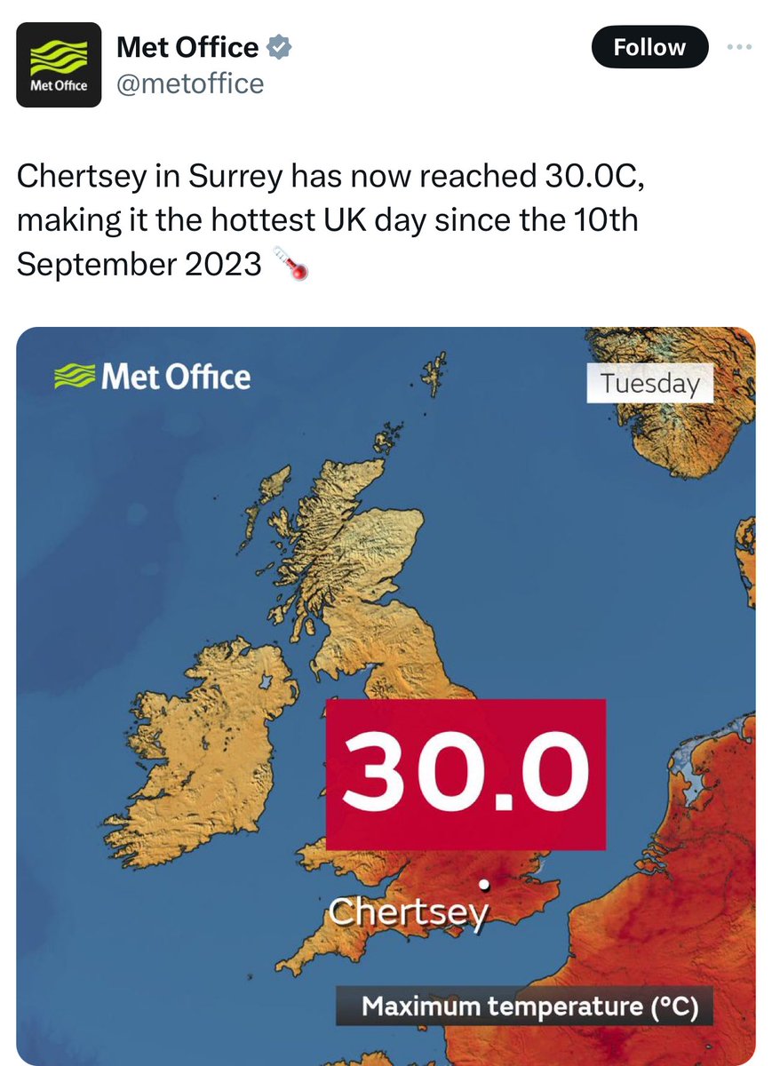 CLIMATE CHANGE - Or is it. Yesterday the Met office declared the heat in Chertsey at 30° was the hottest day in 10 years… They didn’t mention that 1800 solar panels were installed 2 years ago surrounding the Chertsey weather station thermometer. large solar installations can heat the area around them, metal and glass are excellent at reflecting heat back into the atmosphere, absorbing only about 30% of it. A bit like having weather thermometers on the tarmac at Heathrow .. oh 🤡
