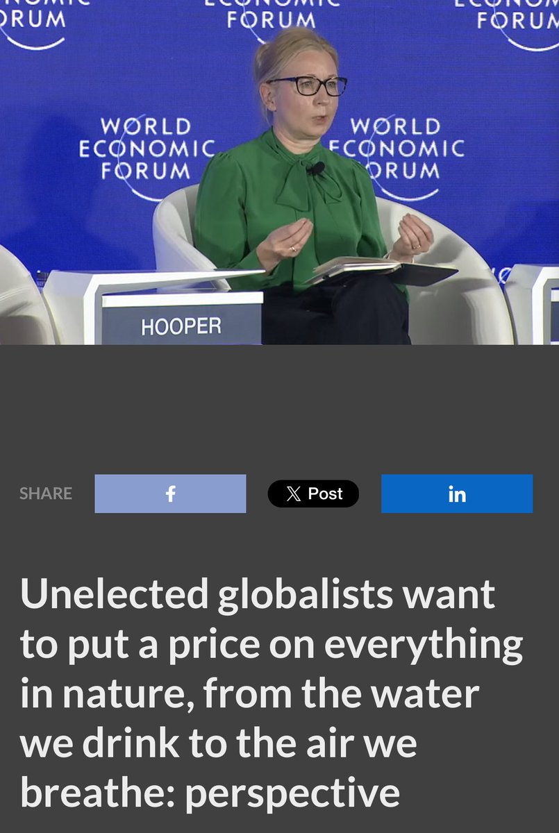 WEF - Humans should be charged for the air we breathe. For a couple of years now the UN has muted the power grab of all natural assets, as the WHO seeks to control all biodiversity, under Agenda 30. This includes the ‘ Corporatisation’ of all food systems, water and oxygen. Lindsay Hooper of the WEF, has blasted humans for expecting water and oxygen to be “unlimited” and “free.” And that Global elites must put them on the “balance sheet” Focus 🔥