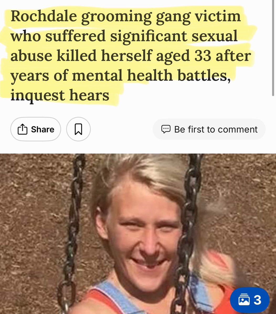 This young woman sat on the train tracks and waited to die. A victim of Rochdale grooming gangs she was forced out of her home when the rapist returned to her town. Terrified and with PTSD she turned to drugs and so dismissed by authorities she didn’t even get a bed in hospital when she was suicidal. Even when she was a ‘missing person’ the police didn’t bother looking for her. And said “nobody would be deployed” she hadn’t mattered to them her entire life. Shh… stop talking about it, everything is fine in Britain. It’s just a few bad apples. Except it isn’t.
