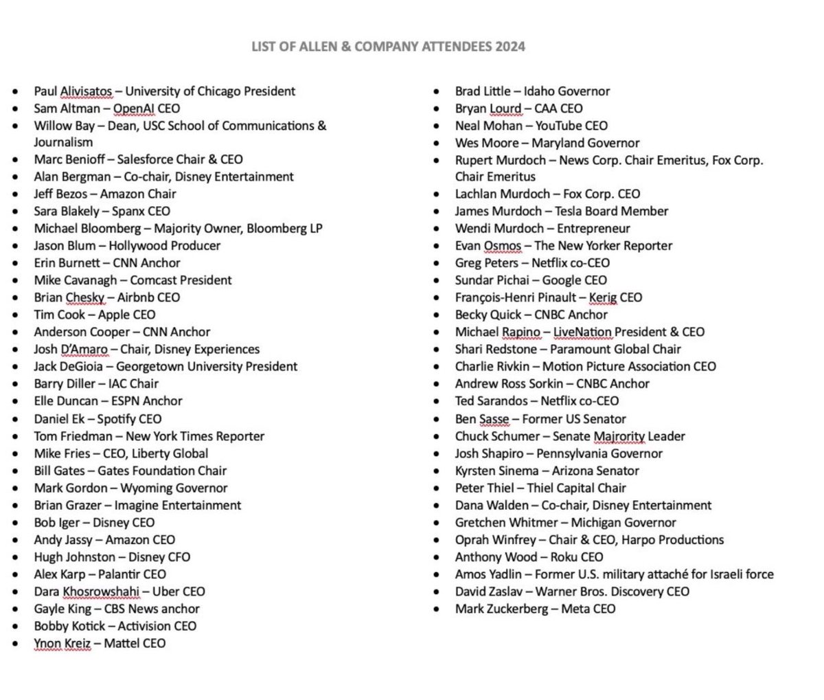 SUN VALLEY -The billionaires, the controllers of media and world business leaders, have flown to Idaho in their private jets, for their annual ‘retreat’ Here they will plan how much more nudging you will need, in order to do as they want you to do. Here’s the guest list ‼️ https://t.co/g4fvZWper3