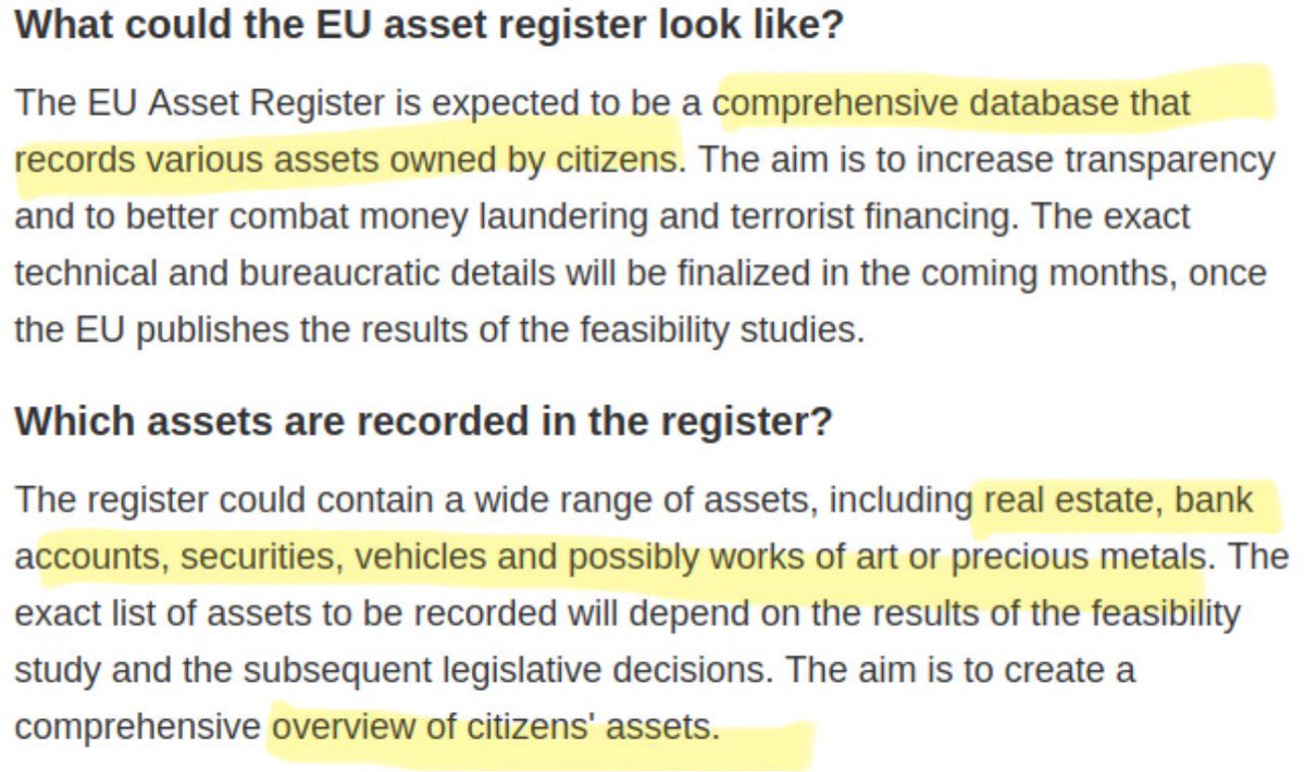 🚨EU - is planning an all asset register database of every citizen, so they can introduce a WEALTH TAX. Citizens will have to report their individual assets including Bank accounts balances, property, jewellery, cars & art. In order to create a union wide ‘wealth’ tax. (Also handy for seizing those non CBDC purchases in the future) Massive overreach of a totalitarian state. So of course Labour will love it! Shocker 🚨