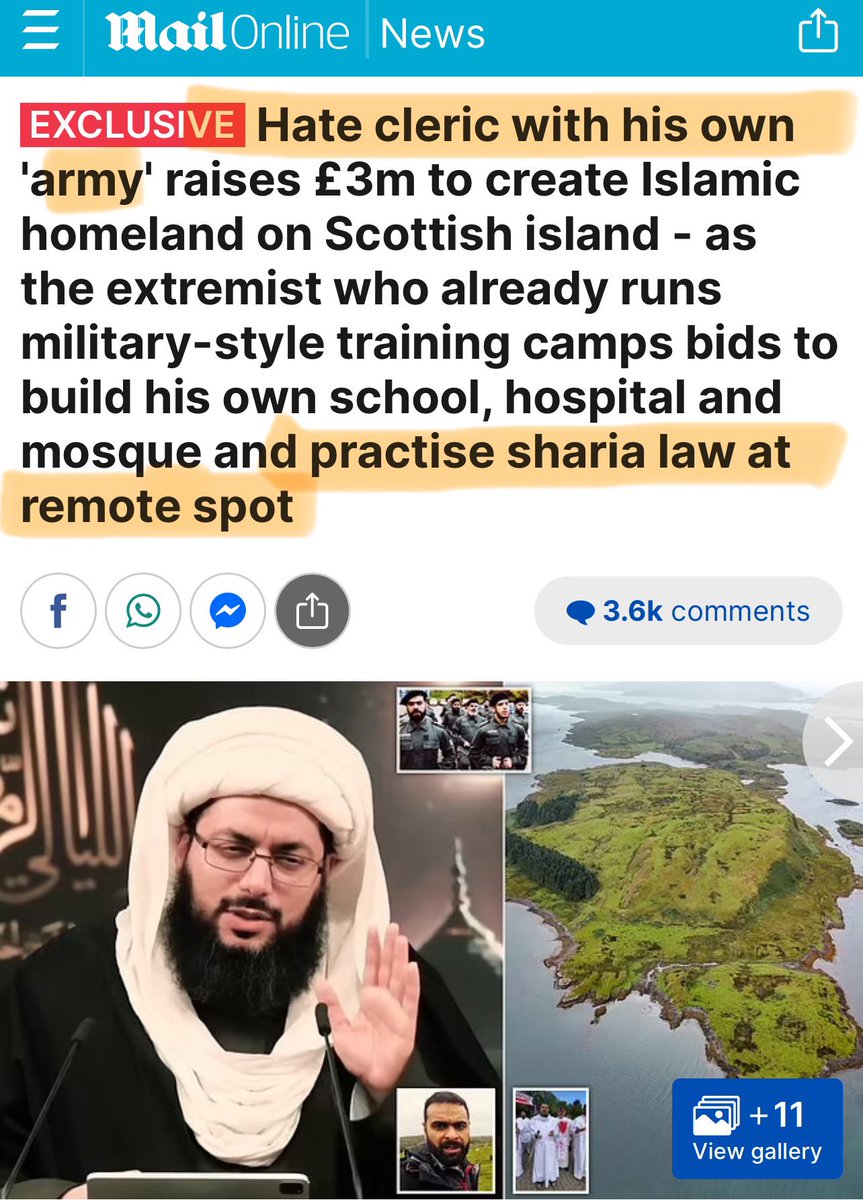 SCOTLAND - What are you doing? 🤡 A hate preacher, who runs military-style training camps, is buying a £3 million island to build a school, hospital & mosque, to practise sharia law! We have our own laws in the UK … Enforce them! https://t.co/QK6i6eF5HD