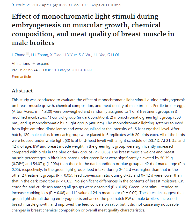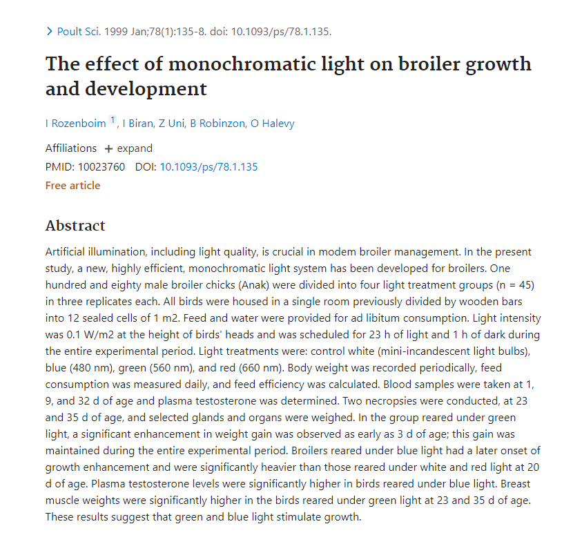 Here's another study showing that green light exposure causes chickens to grow bigger with more muscle mass.