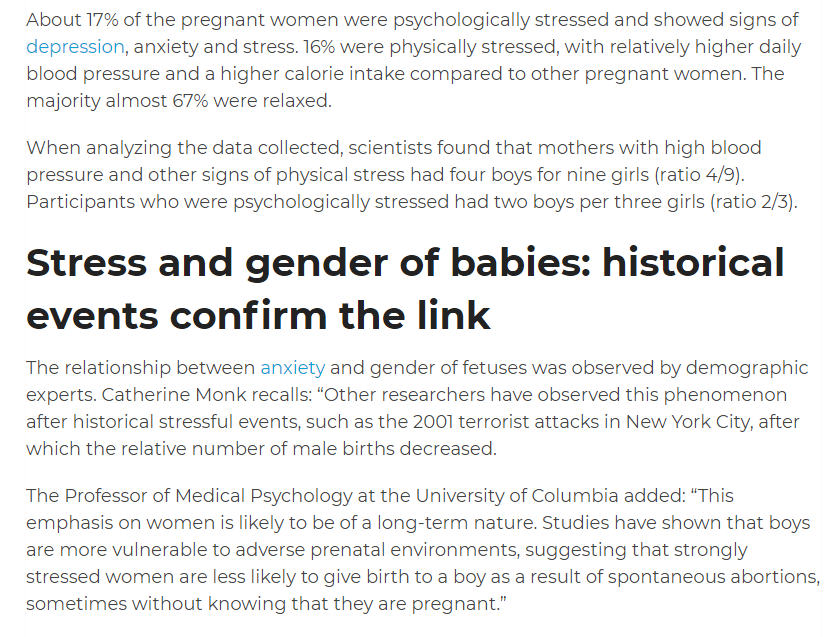 Stress during pregnancy is a significant cause of premature births and can also significantly skew the sex ratio towards female births. This is one of the reasons why the widespread adoption of plant-based diets is bad news. I discuss this in The Eggs Benedict Option. 👇