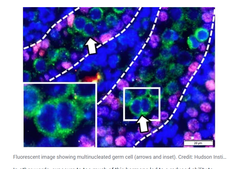 The researchers showed that elevated activin A not only damages germ cells (sperm precursors) but also the Leydig cells, which produce testosterone in men. "Unusually, germ cells exposed to high activin A frequently contained more than one nucleus (multinucleated—see image below) and were abnormally localized outside of the testis cords, reducing the number of sperm precursor cells at birth by half," one of the researchers said.