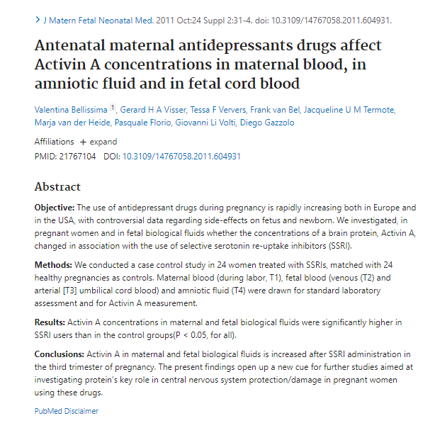 Here's one of many studies showing significant elevation of activin A levels in maternal blood, amniotic fluid and fetal cord blood during pregnant if the mother is on antidepressants. 17.7% of women in the US are on antidepressants.