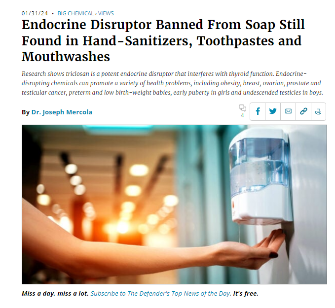 Triclosan is a vicious endocrine disruptor that the FDA banned from soaps, but it's still found in hand sanitisers, toothpastes and mouthwashes (all products you don't need). There's even a suggestion that the explosion in cases of precocious puberty during the pandemic may have had something to do with children's near-constant use of hand-sanitisers containing triclosan. In Italy, cases of precocious puberty tripled during the pandemic. What's particularly bad about it is that it can increase the body's absorption of other endocrine disruptors, such as BPA from thermal paper (i.e. receipts, paper money), by as much as 10,000% according to a number of studies.
