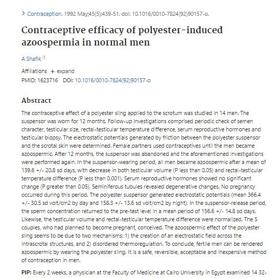Daily reminder that tight polyester underwear, when worn for long enough (only a period of months), is a 100% reliable form of non-hormonal contraception for men. Your balls literally stop producing sperm. Contrary to this study, the effects are probably permanent to an extent. https://t.co/HEWWTz5c1j