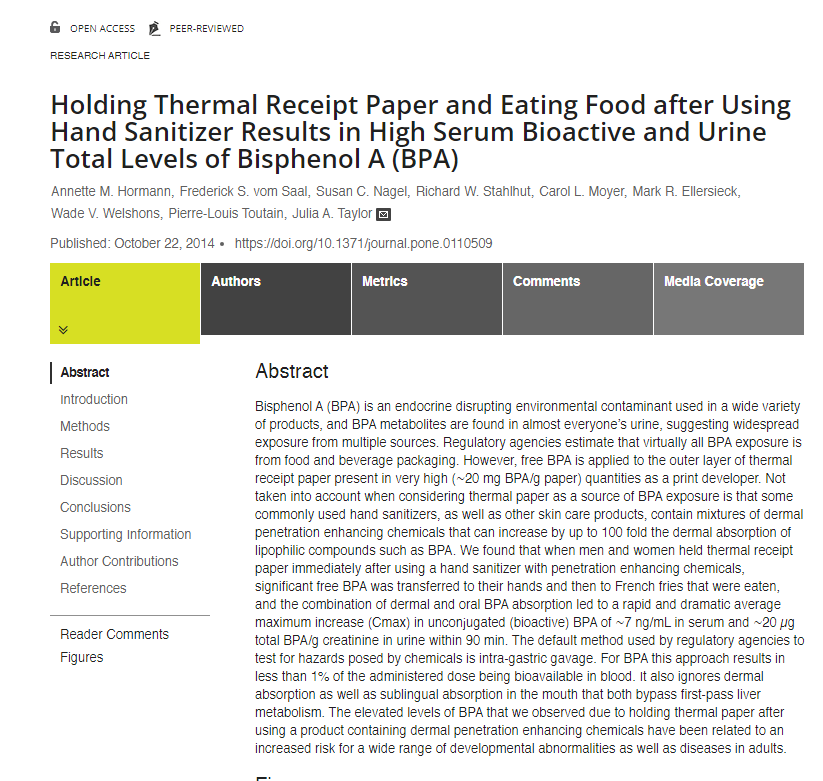 Triclosan, which is found in a wide variety of health products including hand sanitisers, can increase the absorption of BPA through your skin 100x. That means if you sanitise your hands and then touch thermal paper like a receipt, you'll get a massive dose of estrogenics. https://t.co/eFhtHDLCh2