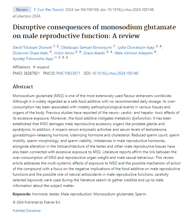 Monosodium glutamate, a ubiquitous flavour-enhancer in processed food, damages the testes and prostate gland, reducing testosterone and reproductive function in men. https://t.co/cOqhEZ5k8V
