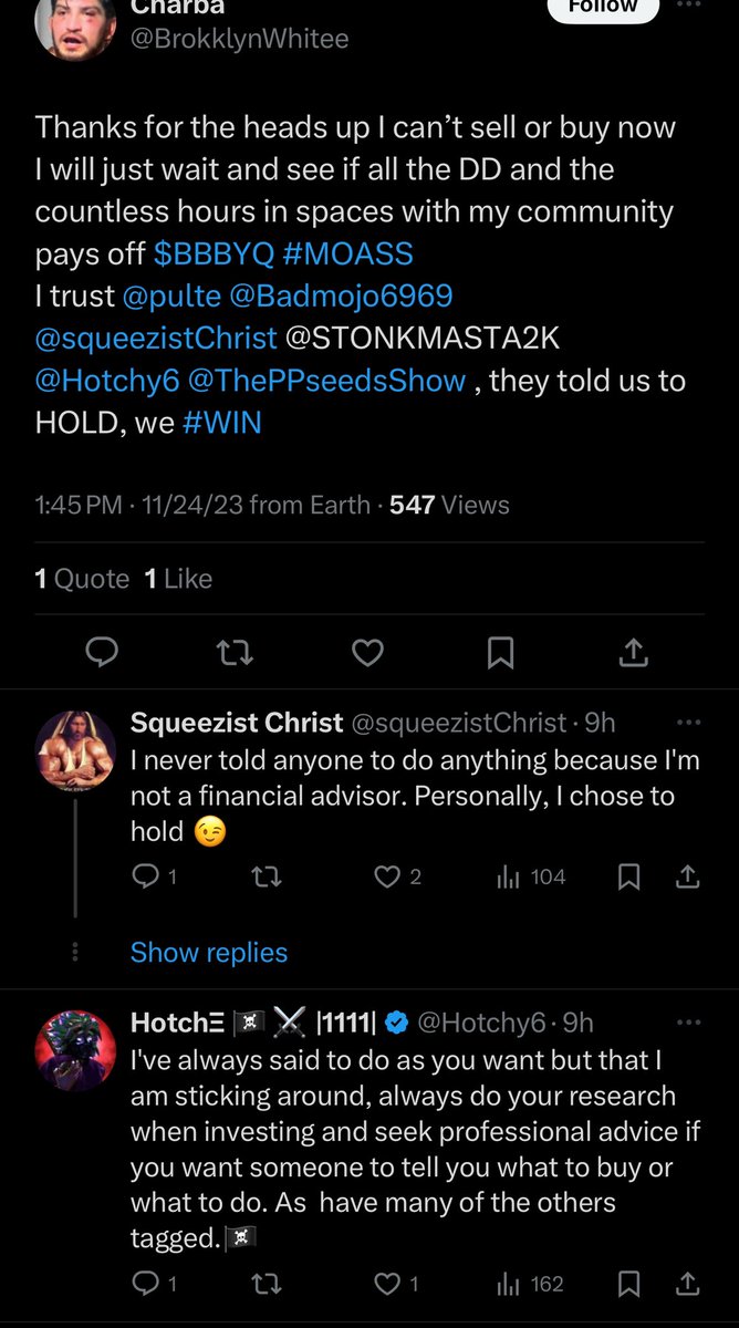 But having a gang of followers on twitter isn't gonna help you recover money. You're not giving your time to help retail investors if you can't possibly have the knowledge of what you're involved in. It's not fair either because maybe 10 maniacs are ruining 99% of patient holders