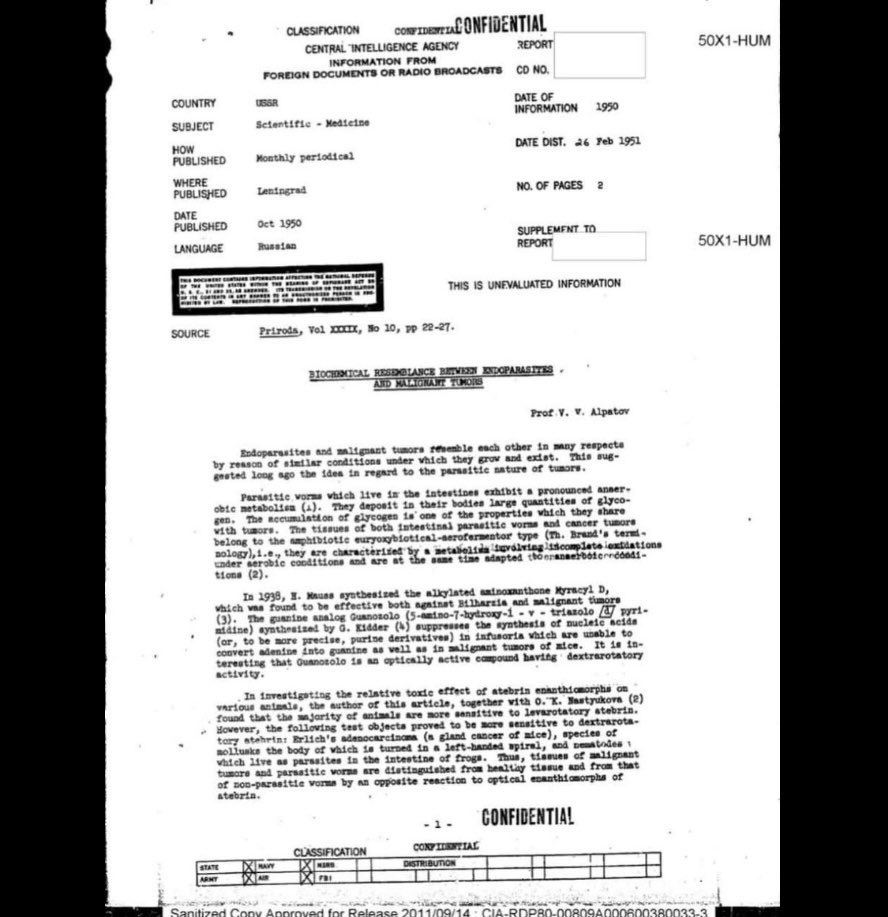 They always knew ivermectin and fenben would be effective. They lied and millions died because of it. This document is a declassified **CIA intelligence report** from February 1951 (distributed 26 Feb 1951), summarizing an article originally published in the Soviet scientific journal *Priroda* (Nature), Vol. XXXIX, No. 10, pp. 22–27, dated October 1950. The report is marked **CONFIDENTIAL** (later declassified and sanitized/released under FOIA in 2011, document ID CIA-RDP80-00809A000600380033-3). It falls under the category "50X1-HUM" (a CIA code for human-source intelligence from foreign documents or broadcasts, often USSR-related scientific/medical info during the Cold War). The CIA collected and translated/summarized foreign scientific publications for potential military, medical, or strategic value. ### Title of the Summarized Article **BIOCHEMICAL RESEMBLANCE BETWEEN ENDOPARASITES AND MALIGNANT TUMORS** Author: Prof. V. V. Alpatov (or V. Alpatov; likely a Soviet biologist or parasitologist) ### Key Content Summary (Transcribing/Correcting the OCR'd Text for Clarity) The report states this is **un-evaluated information** (meaning the CIA didn't verify its scientific accuracy; they just passed it along). Main points from the article summary: - **Endoparasites** (internal parasitic worms living in the intestines) and **malignant tumors** (cancers) resemble each other in many ways due to similar growth conditions and existence. - Both exhibit **pronounced anaerobic metabolism** (they thrive in low-oxygen environments) and accumulate large quantities of **glycogen** (a stored form of sugar/energy) in their tissues. - Parasitic worms and cancer tissues share similar **amphibolic (adaptable) metabolism** — able to function under both aerobic (with oxygen) and anaerobic conditions. - In 1938, H. Mauss synthesized a compound called **alkylated aminoanthraquinone Myrcayl B** (or similar; text has typos like "Myracyl B" — likely an early experimental drug), and later work by G. Kidder on **5-amino-7-hydroxy-1-v-triazolo(d)pyrimidine** (a guanine analog/purine derivative) showed it could suppress nucleic acid synthesis. - These compounds were tested and found effective against parasites like **Schistosoma** (Bilharzia) and also had activity against malignant tumors in mice. - The author (Alpatov), along with others like Matyukova, tested **atebrin enanthiomorphs** (likely optical isomers or variants of **atebrin/quinacrine**, an old anti-malarial drug) on various animals. - They found that most test animals (especially **laboratory spiral nematodes**? — text garbled; possibly referring to specific worm species) and malignant tumors (e.g., adenocarcinoma in mice, frog intestinal gland cancer) were highly sensitive to one form of the compound. - Parasitic worms in the intestines showed an opposite reaction to non-parasitic worms when exposed to these enanthiomorphs (one form toxic to parasites/tumors, the other perhaps not, or vice versa). - The tissues of tumors and parasitic worms can be distinguished from healthy tissue by their reaction to these optically active compounds. The document is only 2 pages, ends abruptly with classification markings (CONFIDENTIAL, distribution limits to State/ Army/ Navy/ Air/ FBI), and includes standard disclaimers about it containing info affecting U.S. national defense (Espionage Act warning). ### Context During the early Cold War, the CIA monitored Soviet scientific literature closely (via programs like FDD — Foreign Documents Division) for anything that might relate to biological warfare, medical breakthroughs, or propaganda. Ideas linking parasites and cancer were fringe even then (though some metabolic similarities exist, like Warburg effect in cancer cells favoring anaerobic glycolysis). No mainstream cancer treatment emerged from this line of Soviet research. I