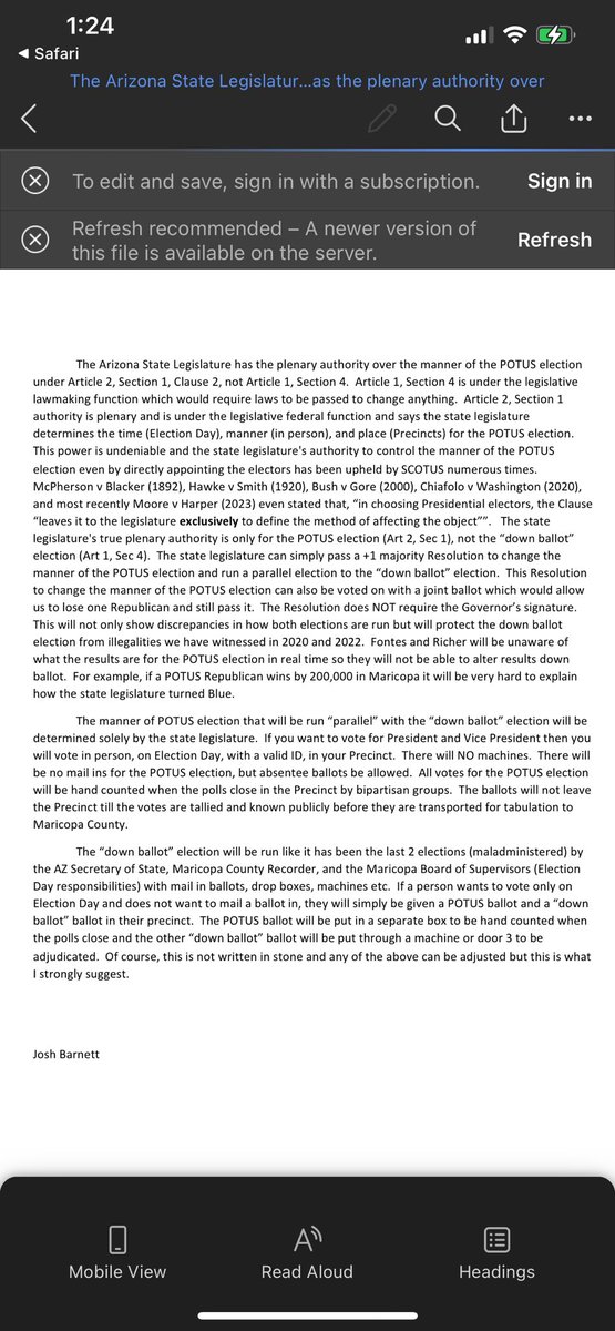From yesterday. It was tabled with no vote. When November 2024 comes around remember who was fighting to protect your vote and who said we should not appoint electors to the Republican primary winner and tell Governor Hobbs to sign the election bill we want or the electors will remain appointed. The appointment of electors would be rescinded and we would go back to a popular vote to determine who the electors go to if she signed the bill that we want to guarantee a legally run election to protect the people’s vote. Remember who wanted to continue using the same illegal elections we experienced from 2020/2022 and who wanted the vote protected. When the next election turns south again, and it will, certain people will have to bear that weight on their backs and it’ll be heavy. Unbearably heavy. Nov 2023 will be 2020 2.0 Mark my words and screenshot this post. Listen here to understand why we are demanding electors be appointed. @IvanRaiklin https://x.com/barnettforaz/status/1758167803742552344?s=46&t=jyh_a9CLHL6-pHOfzge8_Q
