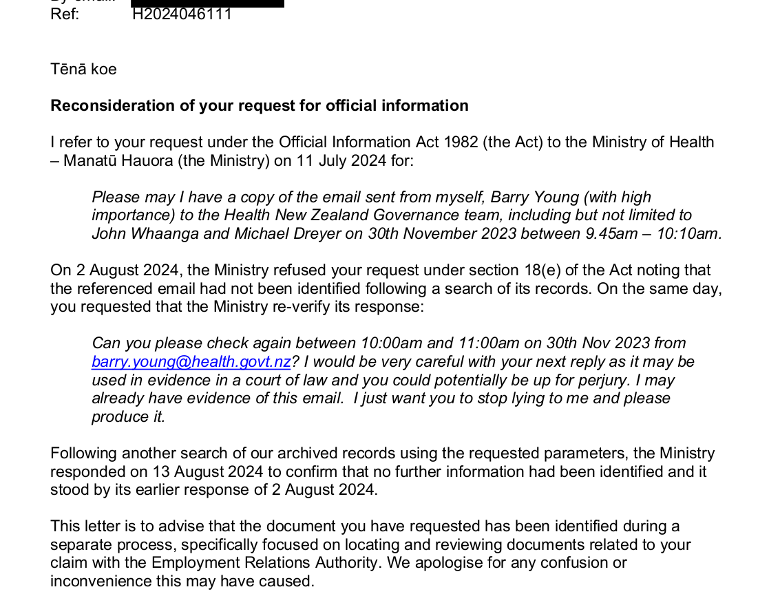 Breaking! Yes this is an actual OIA. H2024046111 First denying the existence of an email I sent to Health NZ Bosses warning of the dangers of the covid vaccine. Then doubling down that it did not exist. Finally admitting they had it all along! D'oh! Way to instil trust guys! https://t.co/bPYyRLVktu