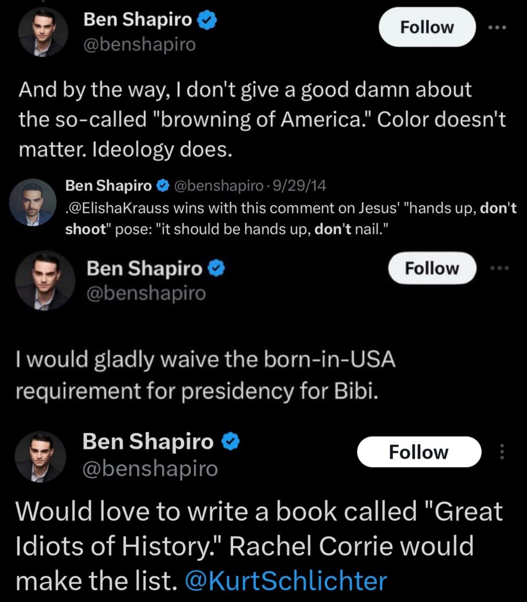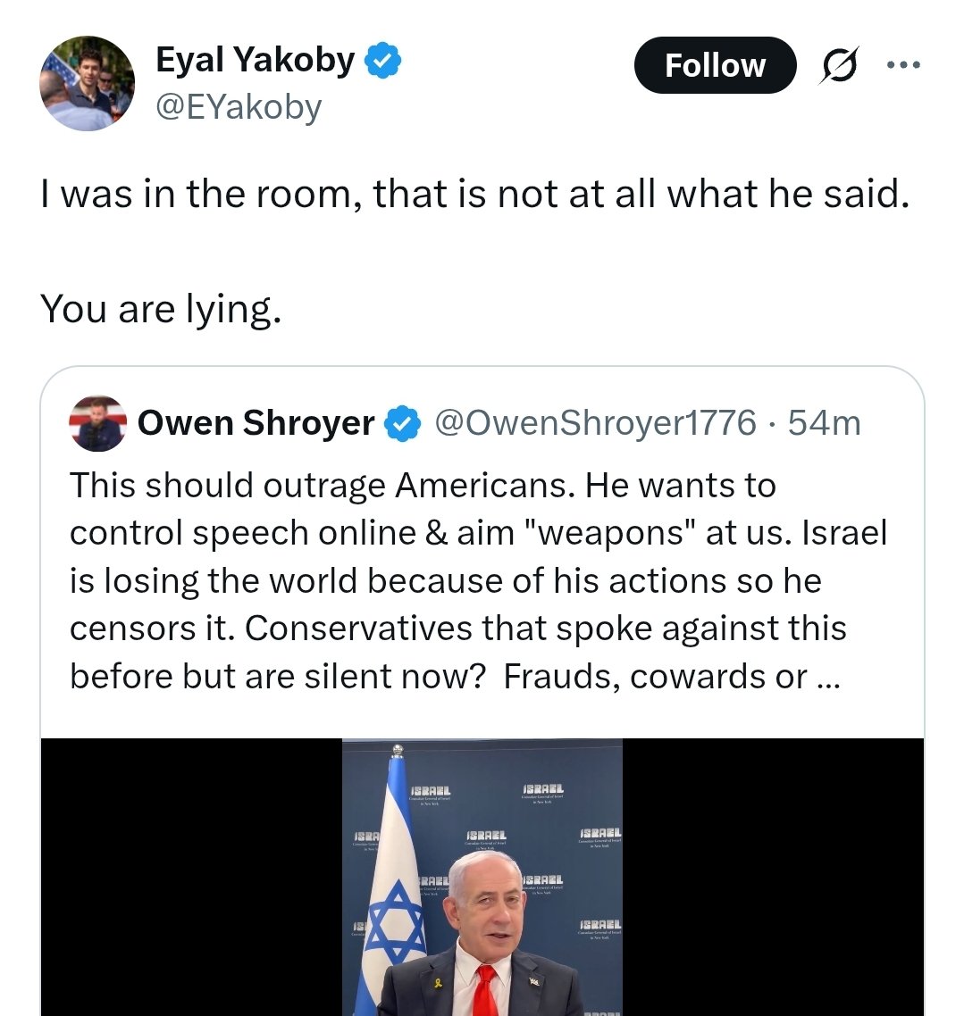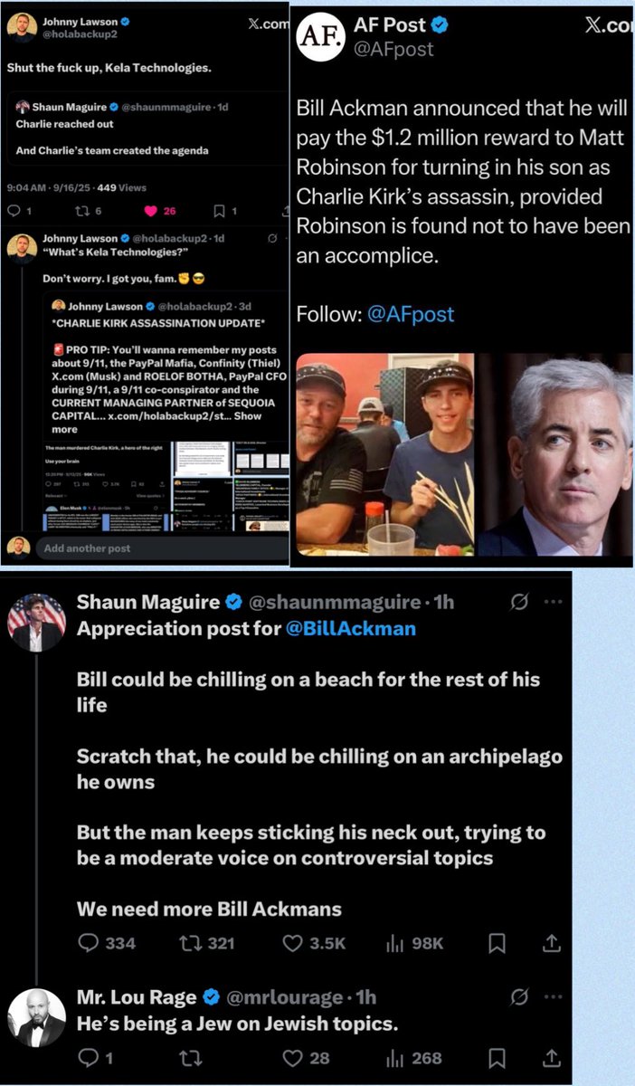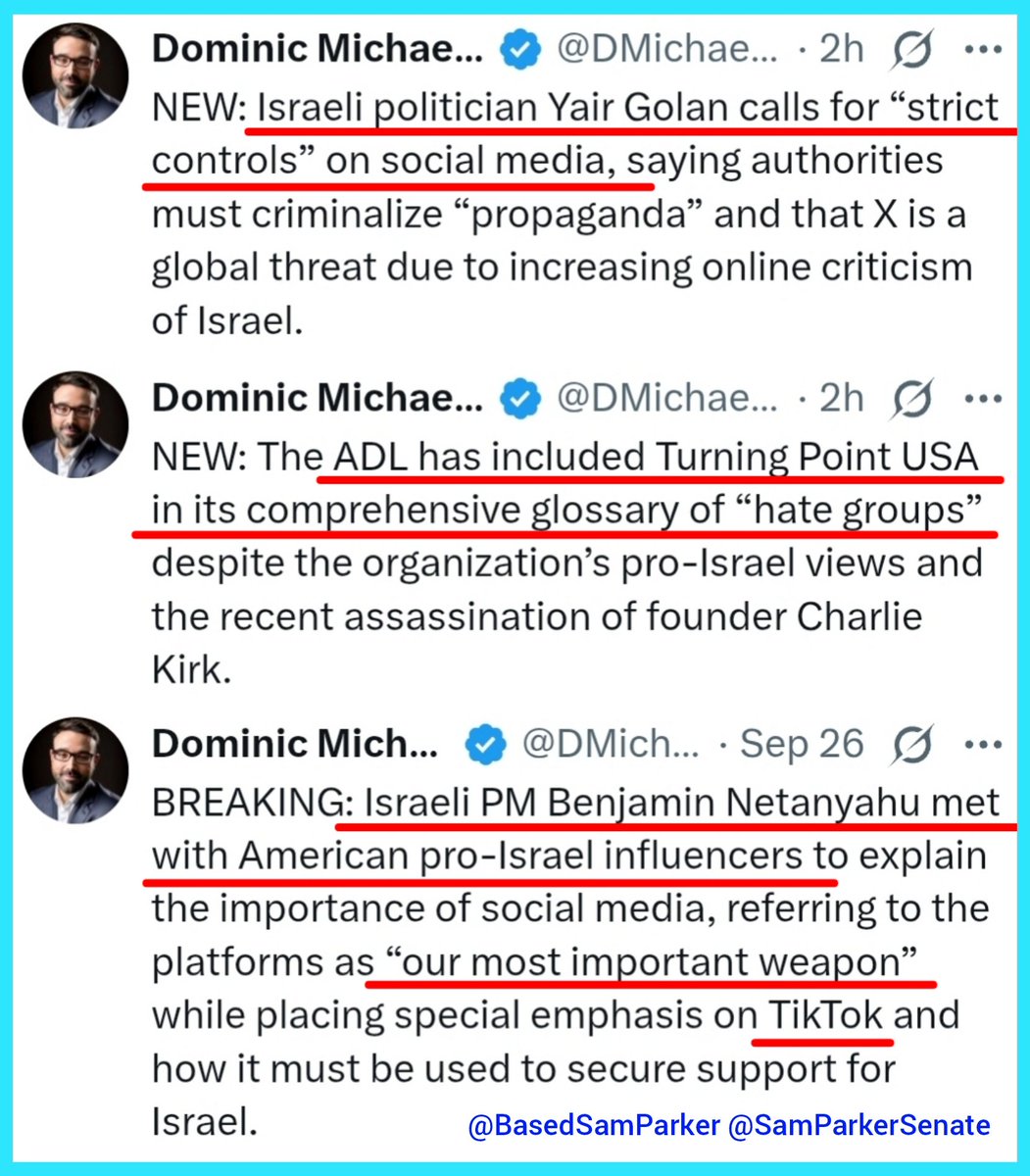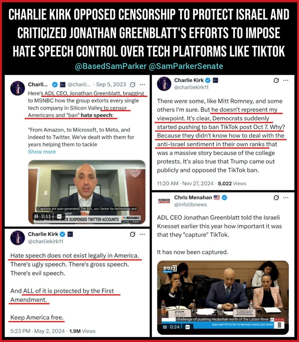 1/ You know who was a harsh critic of more social media censorship in order to protect israel—especially on Tiktok—and would have opposed it? Charlie Kirk You know who opposed the ADL's "hate speech" characterizations & criticized Jonathan Greenblatt for wanting to impose more censorship? Charlie Kirk You know who ran the largest youth organization in the country, with 2,100 college & high school chapters and over 250,000 members? Charlie Kirk You know who was the most influential & organized leader of youth in the country? Charlie Kirk You know who stood in the way of the massive social media propaganda campaign to boost Brilyn Hollyhand, the 18-yr old ultra unironic pro-israel Charlie Kirk clone? Charlie Kirk You know who overshadowed the recent massive youth influencer operation israel started rolling out in perfect coordination with its acquisition of Tiktok & Ben Shapiro's boost of Brilyn Hollyhand? Charlie Kirk You know who would have criticized Benjamin Netanyahu for coming to American soil and calling for israeli weaponization of social media against israel's enemies (i.e. anyone who criticizes israel)? Charlie Kirk You know who wouldn't have bought into the propaganda blitz by total israel-first shills & would have continued platforming high-level, prominent criticism of israel (albeit limited)? Charlie Kirk If you suspect a conspiracy behind the assassination of Charlie Kirk, but are struggling with motive and/or timing, what do you think Charlie Kirk might say?
