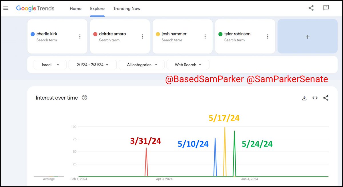 5/ See For Yourself: https://trends.google.com/trends/explore?date=2024-02-01%202024-07-31&geo=IL&q=charlie%20kirk,deirdre%20amaro,josh%20hammer,tyler%20robinson&hl=en