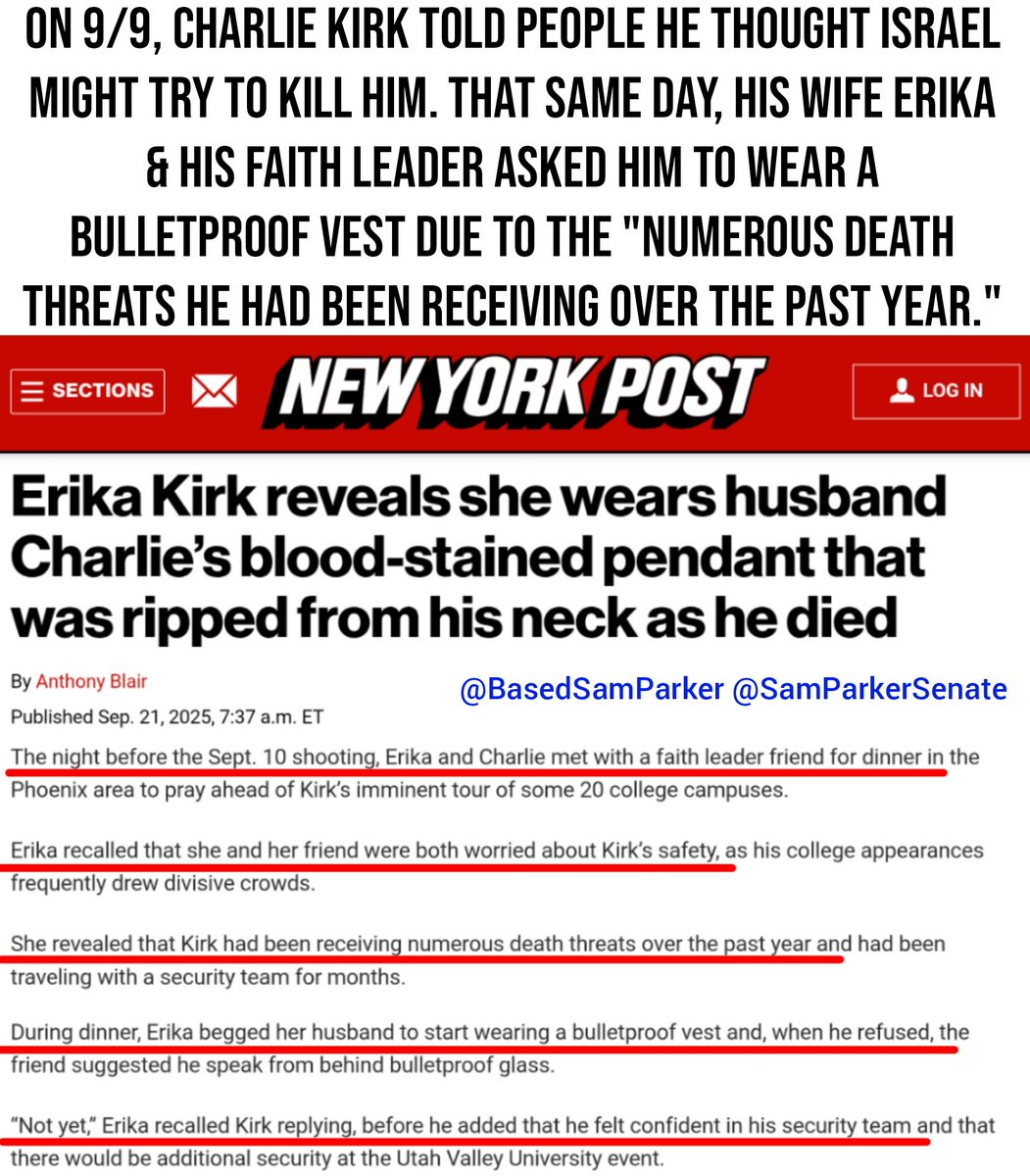 WHAT DOES ERIKA KIRK KNOW? Fact: Charlie himself had recently indicated israel might try to kill him. Fact: Erika Kirk admits she knew about the "numerous" death threats Charlie had been receiving. Fact: Charlie thought these threats merited extra security & Erika thought they merited a bulletproof vest. Fact: Erika expressed her desires for him to wear the vest the same night Charlie allegedly texted people "They're trying to kill me." QUESTIONS ▪️What does Erika Kirk know? ▪️Who did these threats come from? Who is "They?" ▪️What had them both so spooked? Was it really just random or general threats from kooky "Leftists?" Since Erika had just proposed a vest for the first time, this suggests a recent & significant development. ▪️Why did Charlie single out israel specifically? ▪️When did the first israel-centric threats begin? Over what? ▪️Why did Josh Hammer spend the last month lying about Charlie's shifting position on israel? What else is he lying about? What lies did he tell Charlie? Who else besides me wants an immediate and full disclosure of these "numerous death threats?"