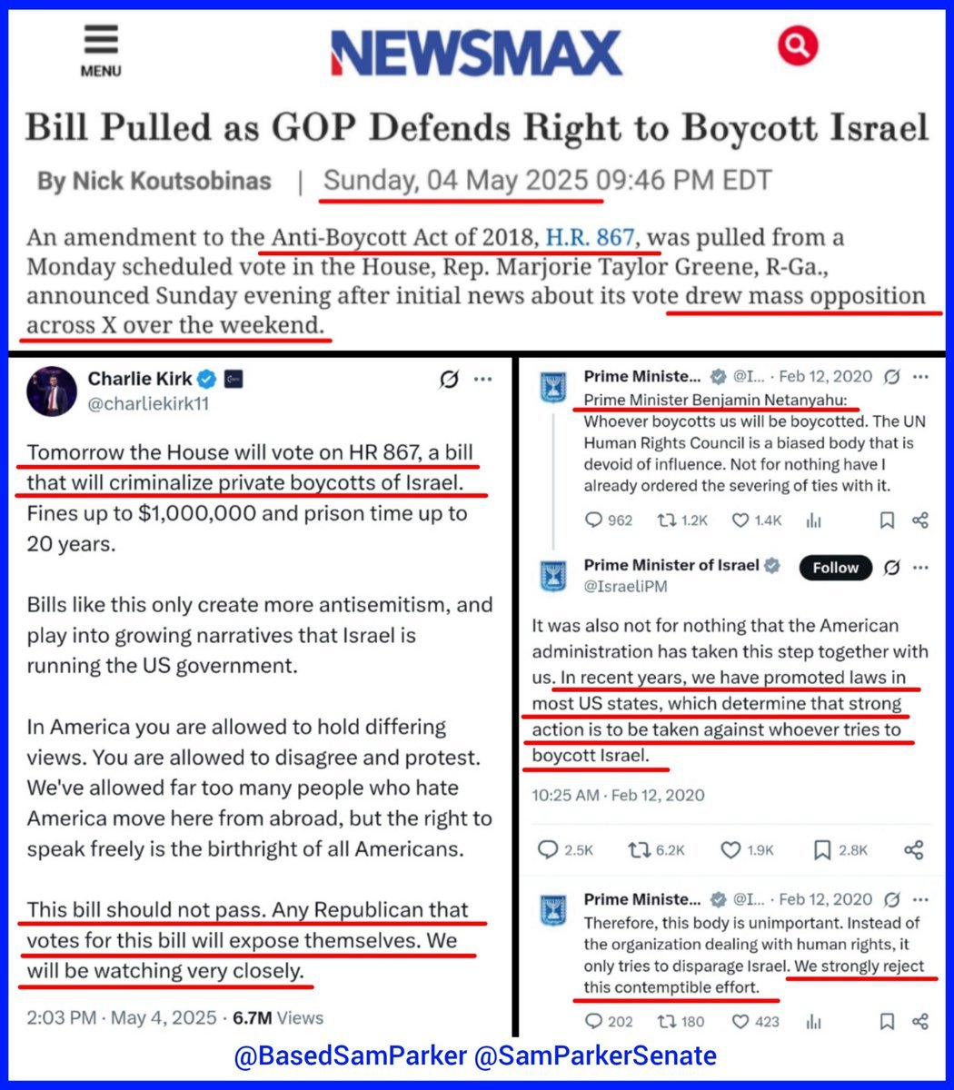 "Charlie Kirk was israel's greatest ally, why would they kill him?" 1. Charlie Kirk actively helped kill anti-BDS legislation. (see below) 2. Charlie Kirk actively opposed social media censorship of "hate speech," especially of anti-israel content on Tiktok. (see below) 3. Israel sees those two strategies, anti-BDS laws and recapturing America's youth via Tiktok, as existentially important to its survival. 4. Charlie Kirk declared war on the ADL, the main organ israel uses to implement social media censorship, and the organization that advocated & aided the israeli takeover of Tiktok. (see below) 5. SUMMARY—Charlie Kirk platformed opposition: to anti-BDS efforts, to social media censorship of Tiktok, and to the ADL—making all of those positions acceptable for America's youth—the very demographic whose ideological recapture israel determined is essential to its very survival. (see below) Yes, Charlie was well-intentioned about his approach and wanted to help protect israel. But he was actually the proverbial fly in the ointment. You know what they say about the "road to hell".... Remember: "israel has a right to defend itself (by any means necessary)." Details & Receipts: Last spring, Charlie Kirk led the effort to kill HR 867, a bill that would have made it criminal for Americans to participate in boycotts of israel sponsored by organizations like the United Nations or the European Union. This bill was defeated after massive opposition to it erupted on Twitter, thanks in large part to Charlie Kirk. This placed him in DIRECT opposition to Benjamin Netanyahu and the israeli government which have previously bragged about getting anti-BDS laws passed in 38 US states. (see below) Netanyahu calls boycotts of israel "contemptible," and has declared that "strong action" would be taken against those who support them. In opposing HR 867, and declaring it the birthright of all Americans to engage in such boycotts, Charlie Kirk all but endorsed the BDS movement. He made it okay for his army of American youth, 50-60% of whom oppose israel, to participate in the BDS movement. (see below) I'll also note that Charlie led the effort to defeat this important bill—promoted by Netanyahu and seen as existentially critical to the survival of israel—2 days AFTER sending his infamous letter in which he spent several pages criticizing israel and Netanyahu. How do you think israel liked watching Charlie Kirk help defeat this existentially important legislation critical to its survival—2 days after having the chutzpah to tell Bibi how to do his job in better accommodating objections to israel from America's youth? It's clear from the attempts to pass that law, the passage of laws forbidding antisemitism on college campuses over the last 2 years, the efforts to deport legal aliens who oppose israel, and the israeli acquisition of Tiktok (in order to censor opposition to israel), that israel is determined to COMPLETELY ELIMINATE opposition from America's youth—not platform it and make it acceptable as Charlie Kirk was actively doing. And now we see that subsequent to Charlie's death, the Tiktok takeover is complete with new censorship already being imposed, and israel has launched a massive new propaganda campaign targeting America's youth with bought-off pro-israel influencers who are trying to turn back the clock to "earlier versions of Charlie Kirk" that didn't raise any objections to israel. It would be difficult to ideologically recapture America's youth and make it taboo to criticize israel again with Charlie Kirk taking the nation's largest youth group in a completely different strategic direction, don't you think?
