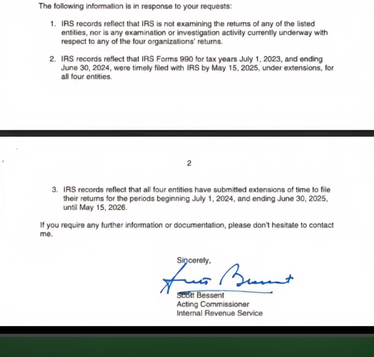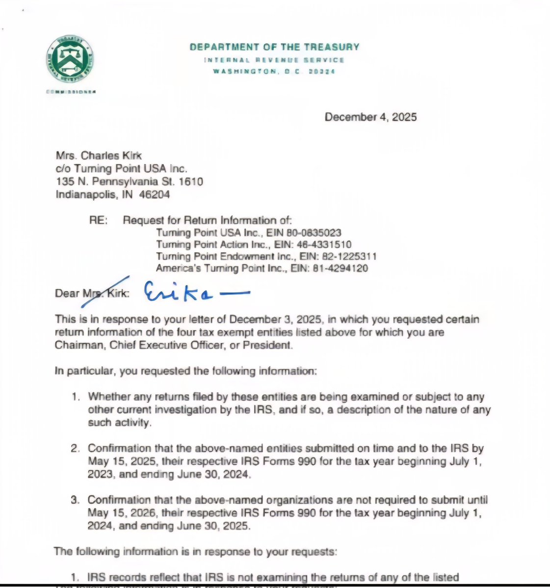 3/ Full text of letter to Erika Kirk from Treasury Secretary Scott Bessent, who signed it as acting commissioner of the IRS. Is this normal? https://t.co/EBHRsdQj7f