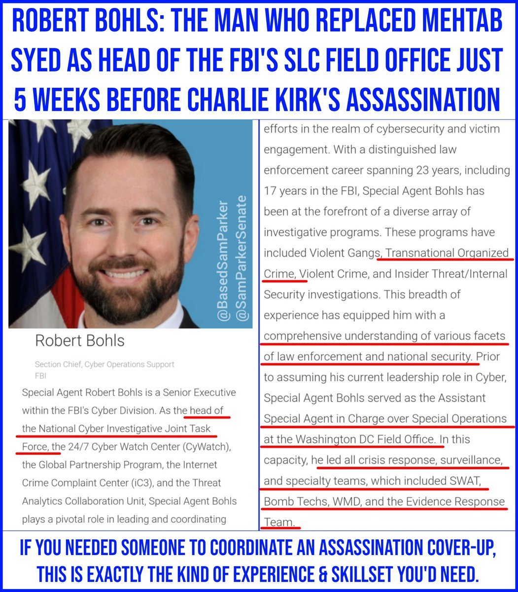 1/ CHARLIE KIRK ASSASSINATION COVER-UP FOLLOW-UP (Disclaimer: this thread is for theorizing and research purposes only. None of this thread should be construed as a definitive assertion or accuasation. Do your own research.) How do you "manage" an investigation in order to protect a fake narrative? You would need a point man, right? Someone to manage & coordinate all critical points of information flow: evidence, media, law enforcement, intelligence community, possible foreign actors, etc. Enter: FBI Agent Robert Bohls, brand new head of the FBI's Salt Lake Field Office. He was installed just a few weeks before the assassination when Kash Patel unceremoneously relieved the former Special Agent in Charge, the "legendary" Mehtab Syed. What if I told you the internet lists a "Robert Bohls" as having moved to Saratoga Springs, UT, somewhere between March - June 2025? Literally down the street from the NSA's massive spying facility and also literally across the freeway/lake from UVU? Perfect positioning to help lead this "investigation" wouldn't you say? The same Robert Bohls has lived in the Northern Virginia area recently as well. That would match his known stint in Washington DC. Curiously, the same Bohls is listed as having lived in Orem several years ago. If this is the FBI's Robert Bohls, I find it noteworthy that he was acquiring housing a couple months before he was to be installed at the Salt Lake field office. Of course, this is all highly speculative. So, let's move on to what we know for sure.